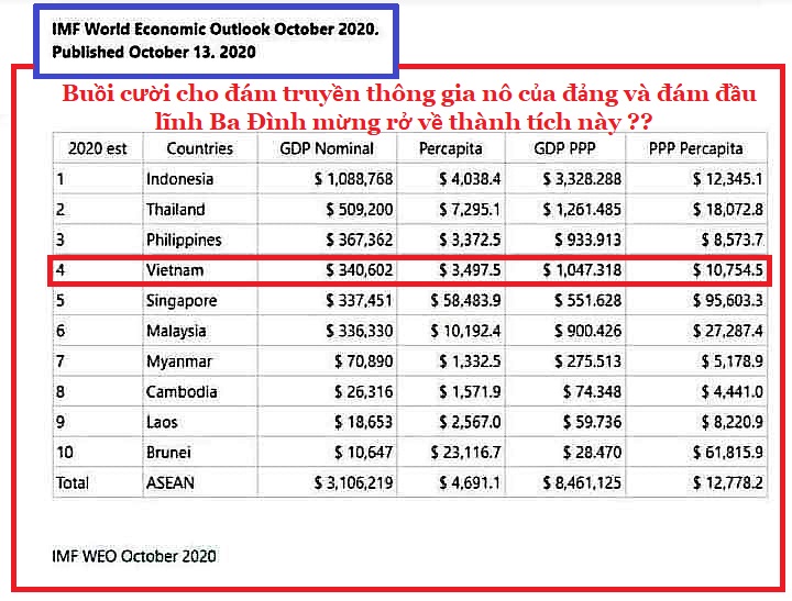 Hàng trăm tờ báo gia nô trong gia nô của đảng, hai hôm nay đồng loạt lên đồng vì được IMF ước tính GDP của VN tính đến cuối năm 2020 sẽ vượt Singapore và Malaysia. Đúng ra, nếu không có trận lũ lụt miền trung đang xảy ra, thì đảng đã cho bắn pháo bông ăn mừng rồi.
